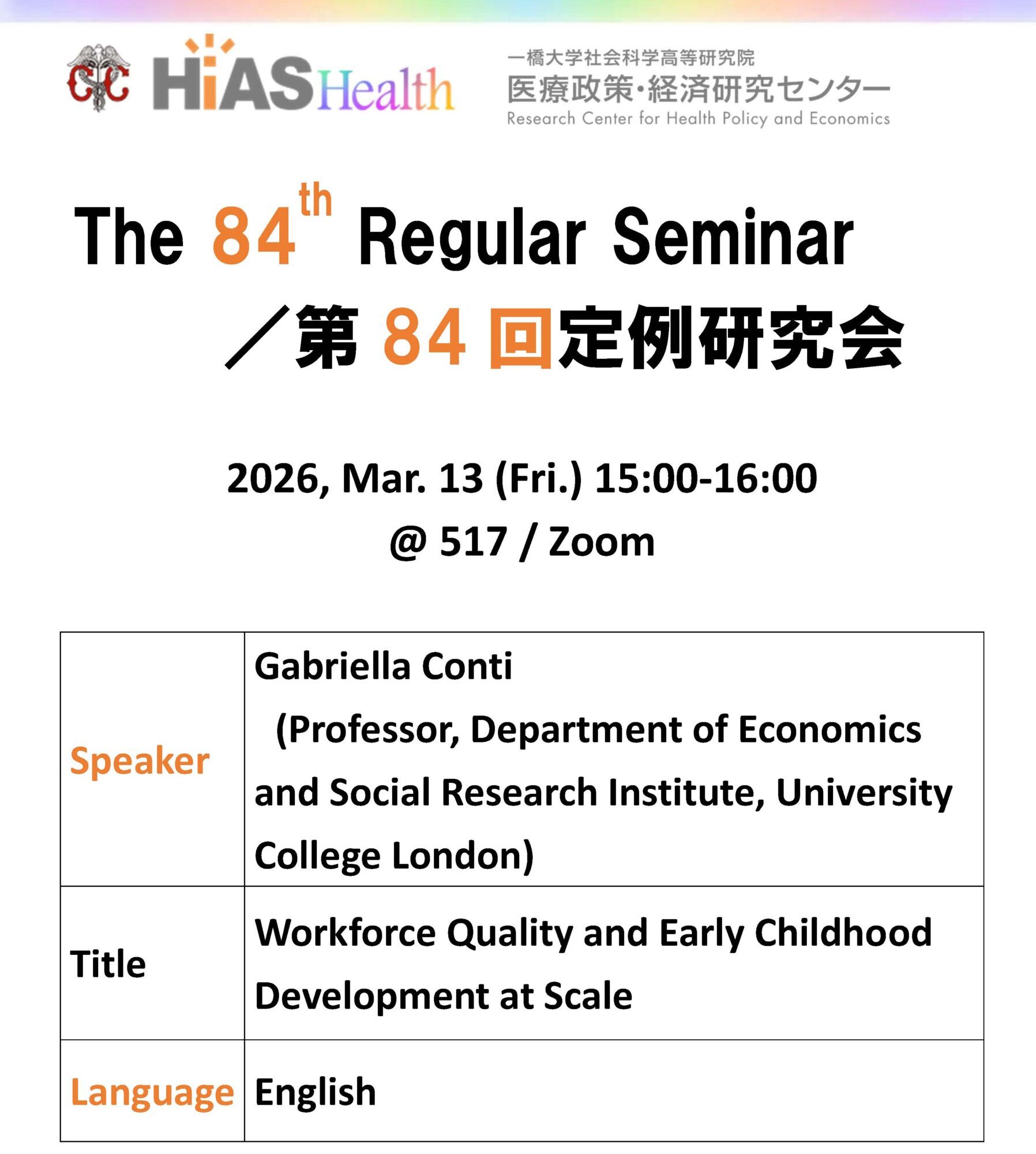 | Speaker | Gabriella Conti (Professor, Department of Economics and Social Research Institute, University College London) |